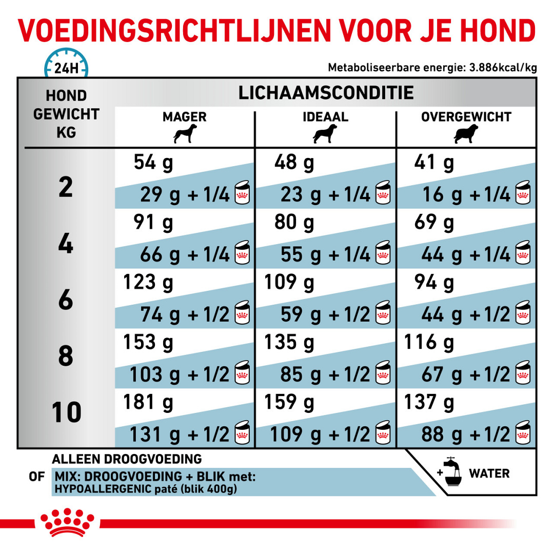 Omdat dit een Royal Canin dieetvoeding is, is het belangrijk dat je deze voeding alleen aan je hond geeft als dit is geadviseerd door je dierenarts. Mocht je overschakelen naar deze voeding, doe dit dan geleidelijk in een tijdsbestek van 7 dagen. Zorg dat je elke dag zorgvuldig de juiste hoeveelheid voeding afweegt, zeker in combinatie met natvoeding.