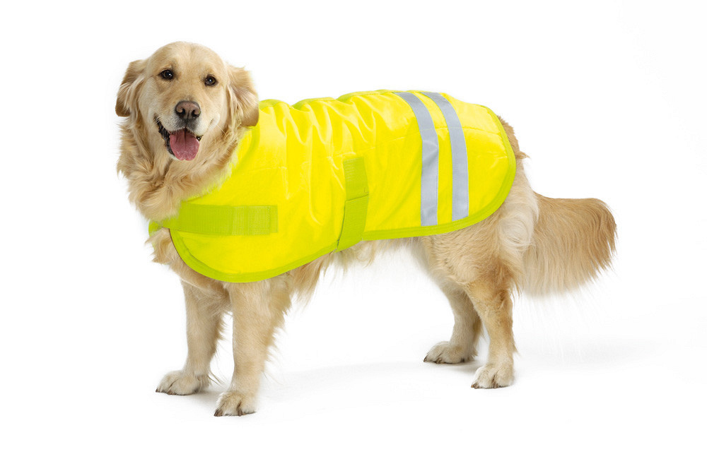 Fluoriserend gele hondenjas van nylon met fleece voering, reflecterende strepen en klittenbandsluitingen.