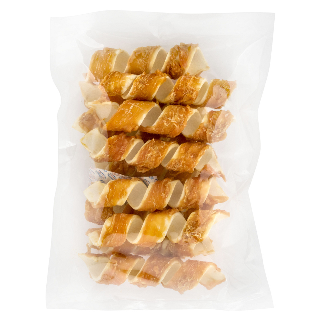 Gedraaide runderhuid met daaromheen kipfilet gewikkeld. Voor extra lang kauwplezier!