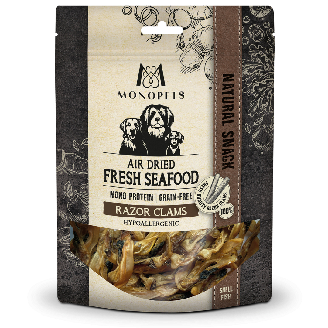 Monopets air dried snacks Fresh Fish Sea Food Razor clams is een smaakvolle hondensnack op basis van één dierlijke eiwitbron. Deze graanvrije en hypoallergene snack van scheermes is een natuurlijke traktatie en bevat zorgvuldig geselecteerde ingrediënten. Het product is geschikt voor alle levensfasen.