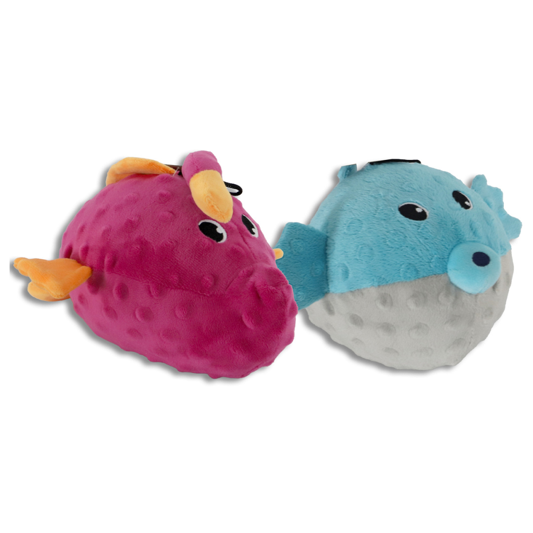 Deze pluchen hondenspeeltjes zijn geïnspireerd op diepzeedieren, maar dan met een speelse twist. Denk aan, een guitige zeeduivel of een vriendelijke puffervis met een knuffelbaar karakter. De speeltjes zijn gemaakt van zacht, duurzaam pluche en zijn perfect voor honden die graag knuffelen en spelen. Elk speeltje is voorzien van een grappig knorgeluid dat geactiveerd wordt door te bijten, en de vinnen bevatten knisperfolie voor extra zintuiglijke prikkels tijdens het spelen.
