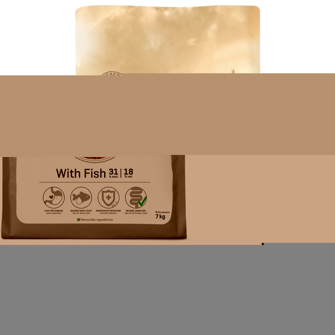 Samenstelling: gevogelte (42%), vis (11%), maïsgluten, rijst, tarwe, maïs, dierlijk vet (rund, gevogelte), gehydrolyseerde kippenlever, bietenpulp, hemoglobine, visolie (zalm), cellulose, mineralen.