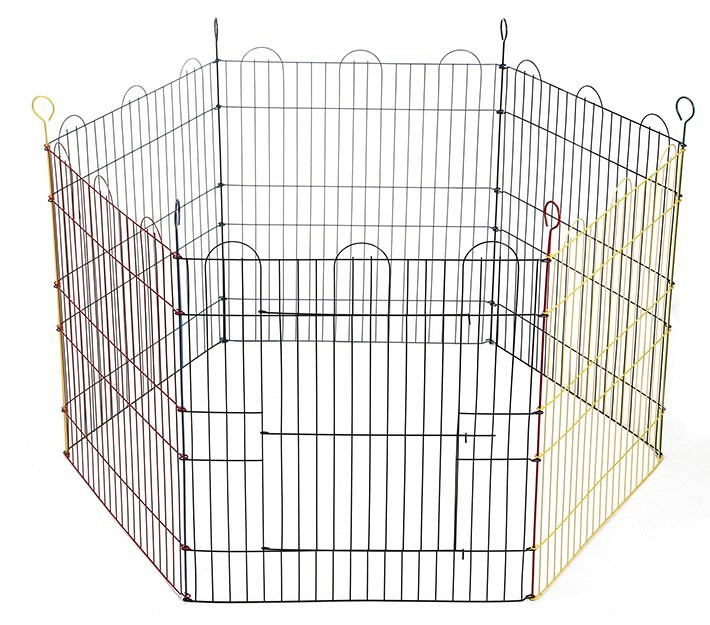 Gekleurde knaagdierenren met 6 panelen van 60 cm hoog voor in de tuin. Diameter 105 cm.
