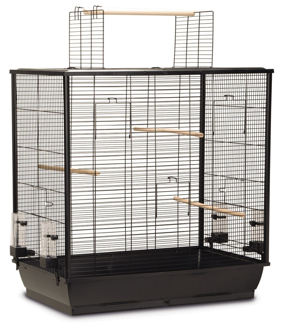 Mooie en grote vogelkooi voor parkieten en agaporniden. Met openklapbaar dak, eet- en drinkbakjes en zitstokjes.